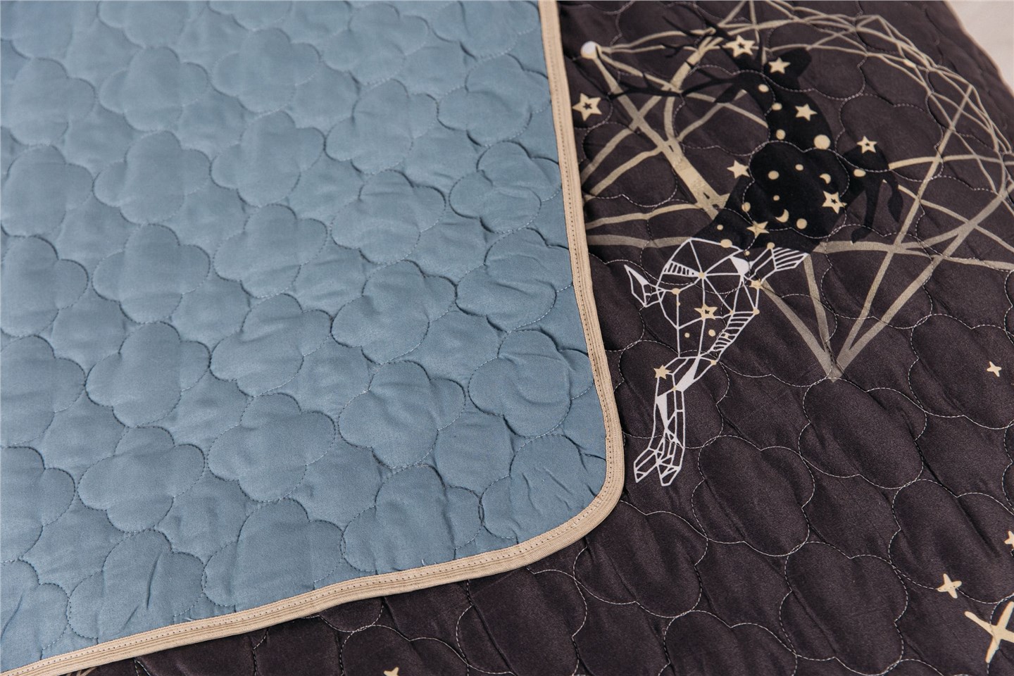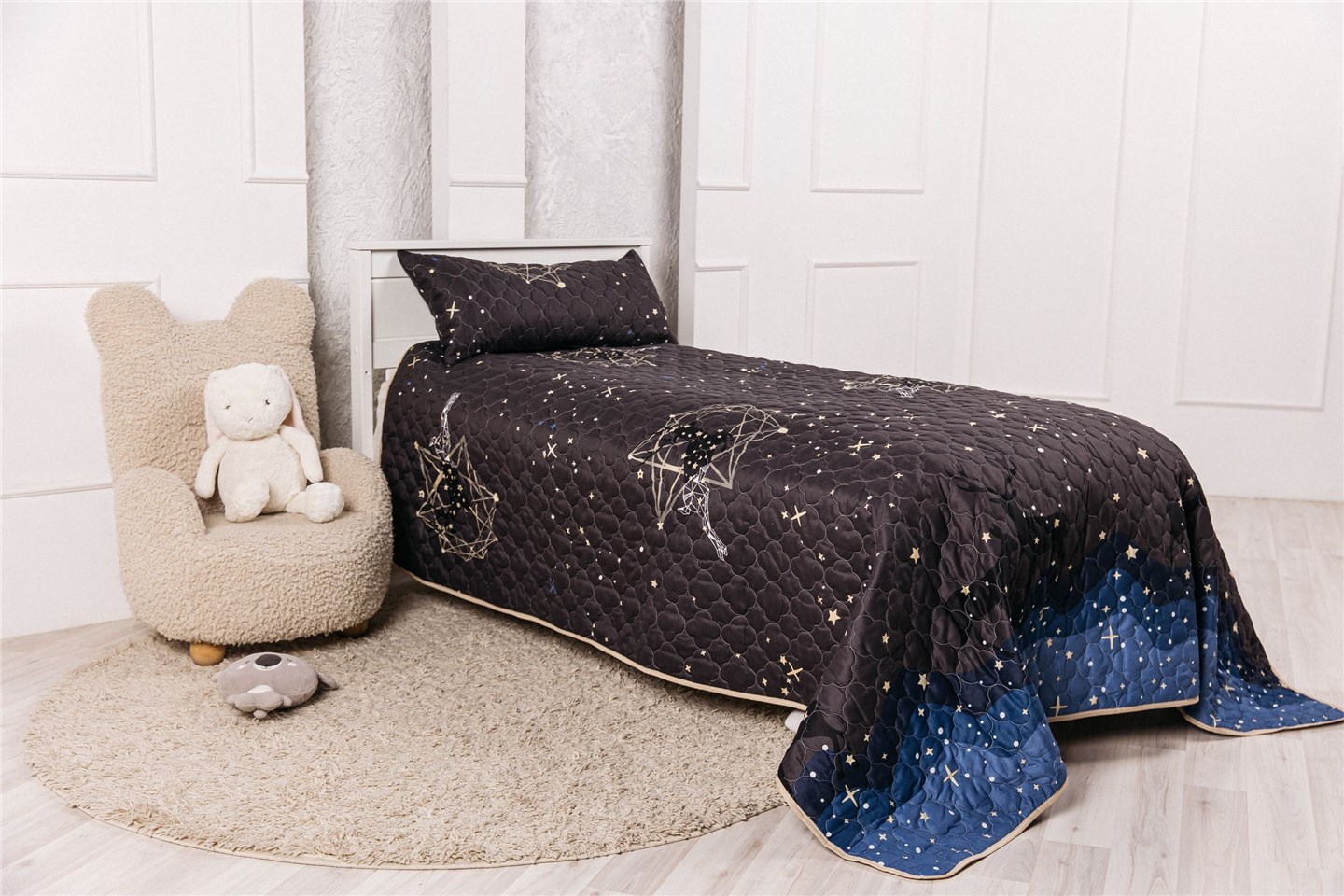 Разверните покрывало — и перед вами совсем другое настроение. Вторая сторона — спокойный серо-голубой цвет, который мгновенно освежает интерьер. Это действительно две модели в одной: яркое «космическое» настроение или мягкий минимализм.