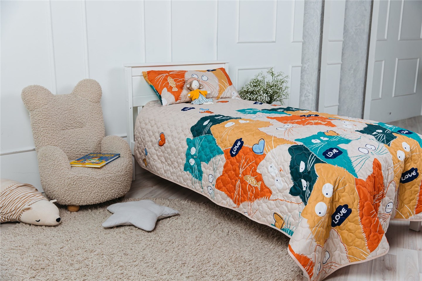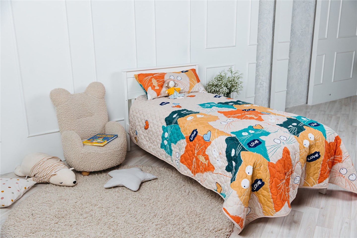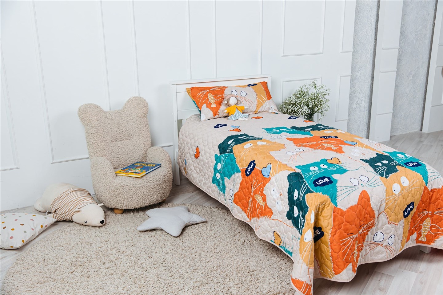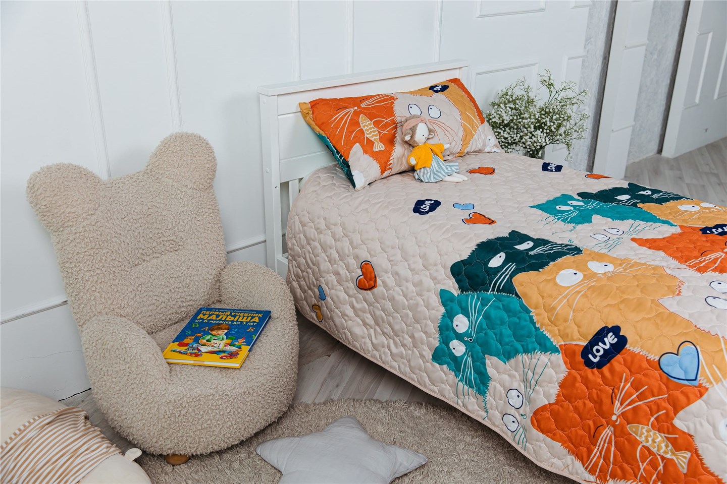 Яркое и жизнерадостное покрывало, которое моментально создаст в комнате атмосферу веселья и уюта. Игривые мордочки котиков, разноцветные пятна и милые сердечки — всё, чтобы сделать интерьер детской по-настоящему живым.