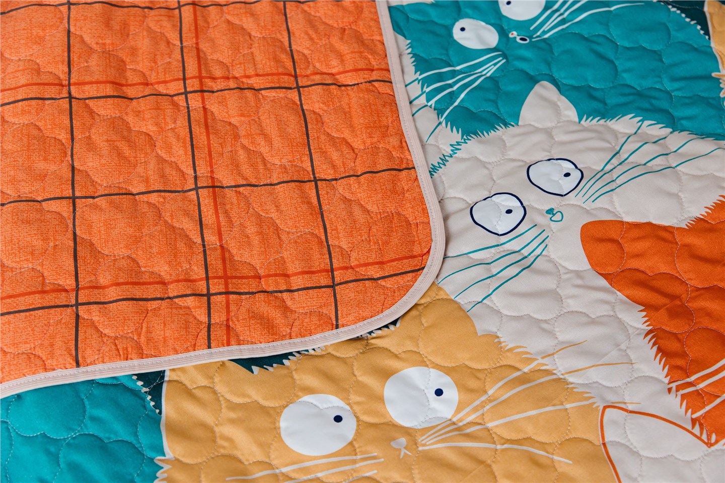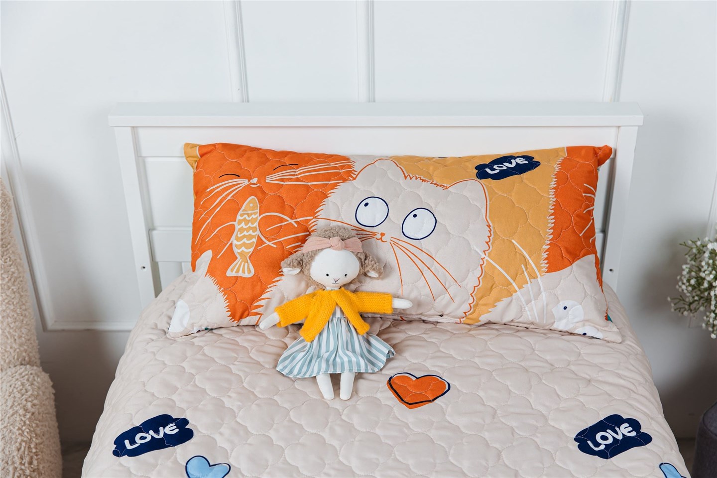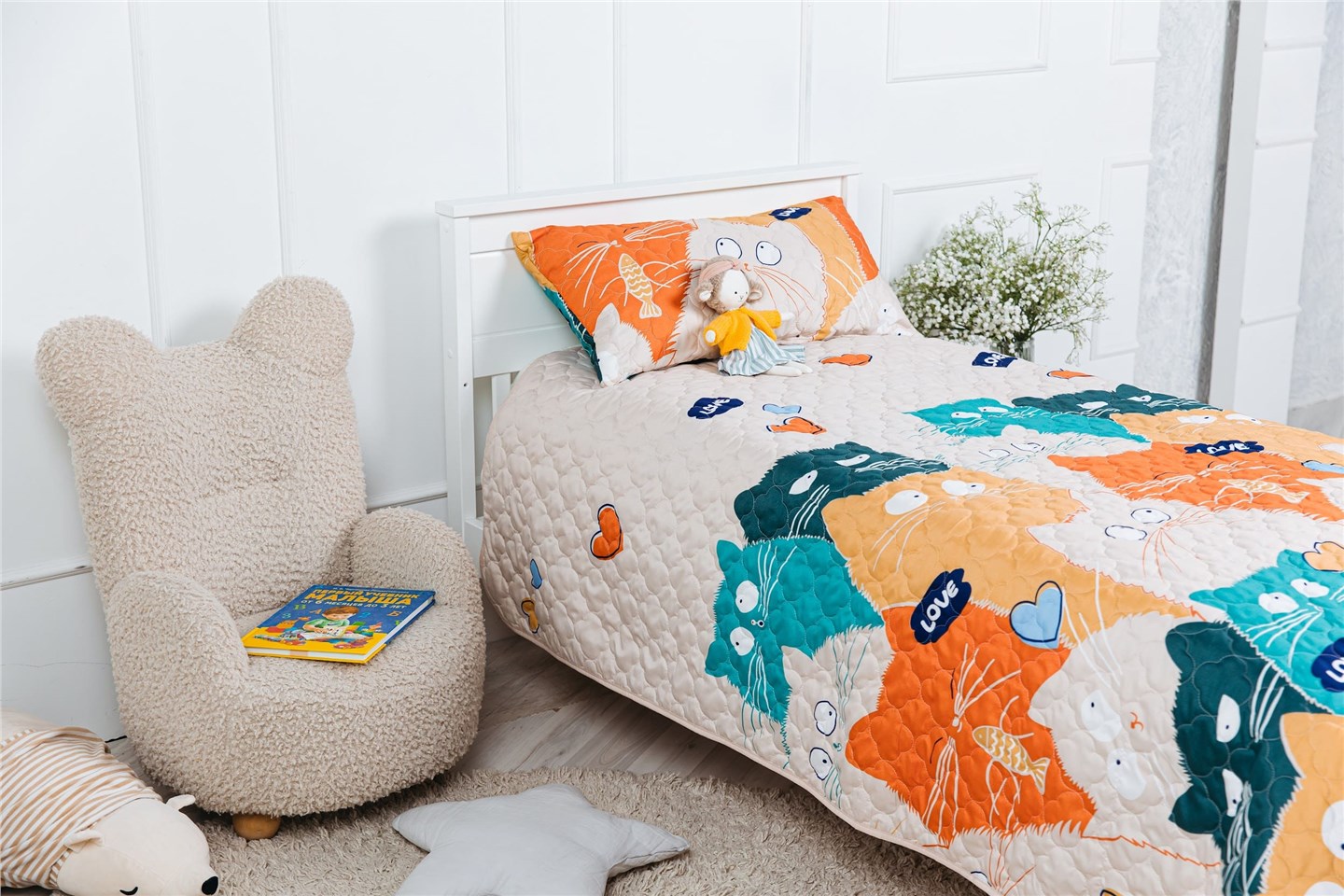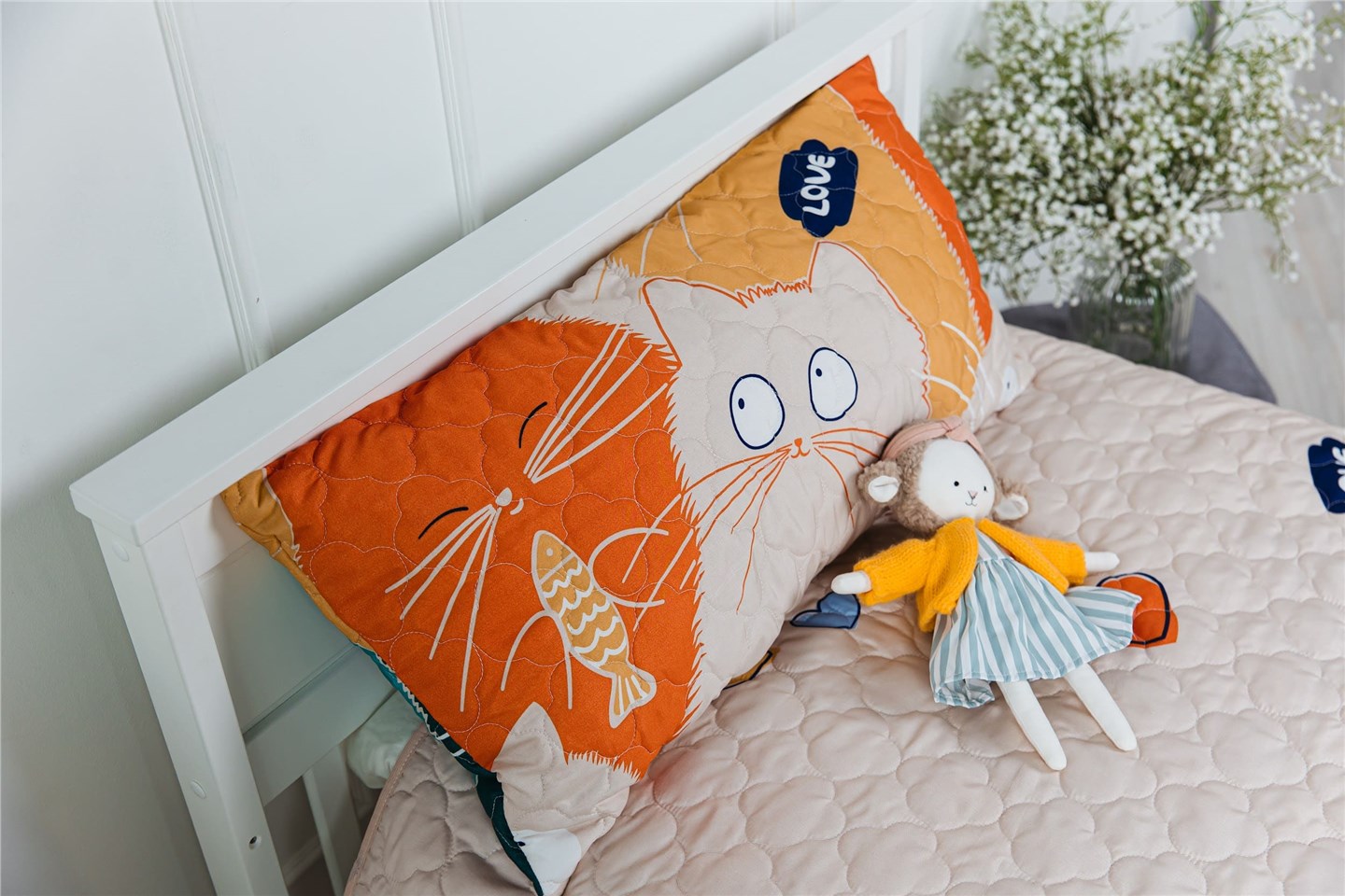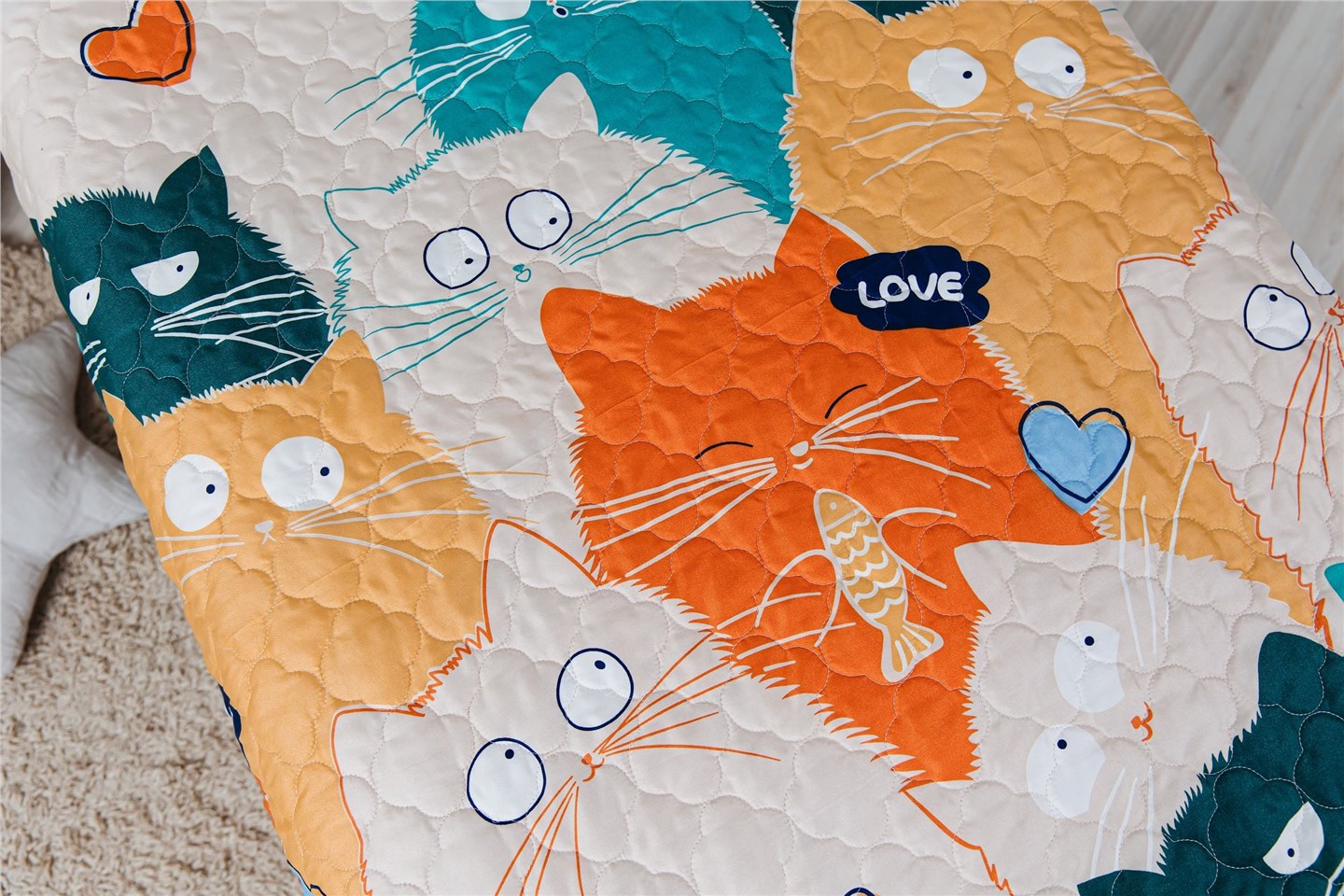 Яркое и жизнерадостное покрывало, которое моментально создаст в комнате атмосферу веселья и уюта. Игривые мордочки котиков, разноцветные пятна и милые сердечки — всё, чтобы сделать интерьер детской по-настоящему живым.