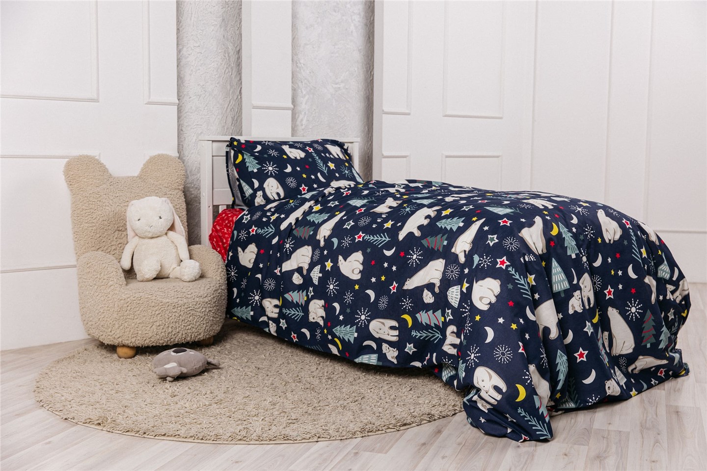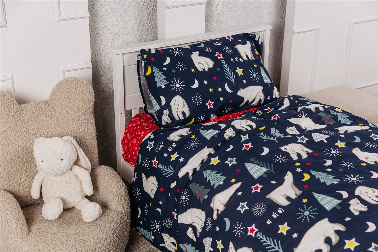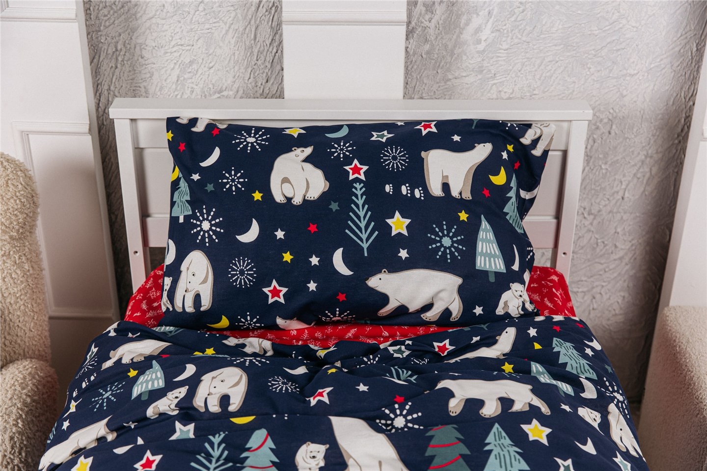 Создайте в детской атмосферу зимней сказки: глубокий тёмно-синий фон, звёзды и луны, хвойные деревья и забавные белые медвежата. Комплект из натуральной бязи мягко укутывает, «дышит» и держит форму после множества стирок. Простыня с резинкой надёжно фиксируется на матрасе, а пододеяльник на молнии экономит время при смене белья. Яркий принт радует глаз и не линяет, красный лист-простыня с белыми веточками добавляет тёплый акцент.