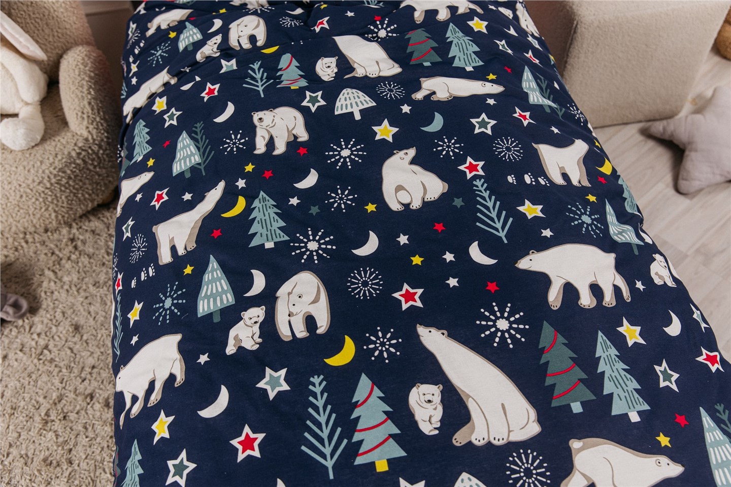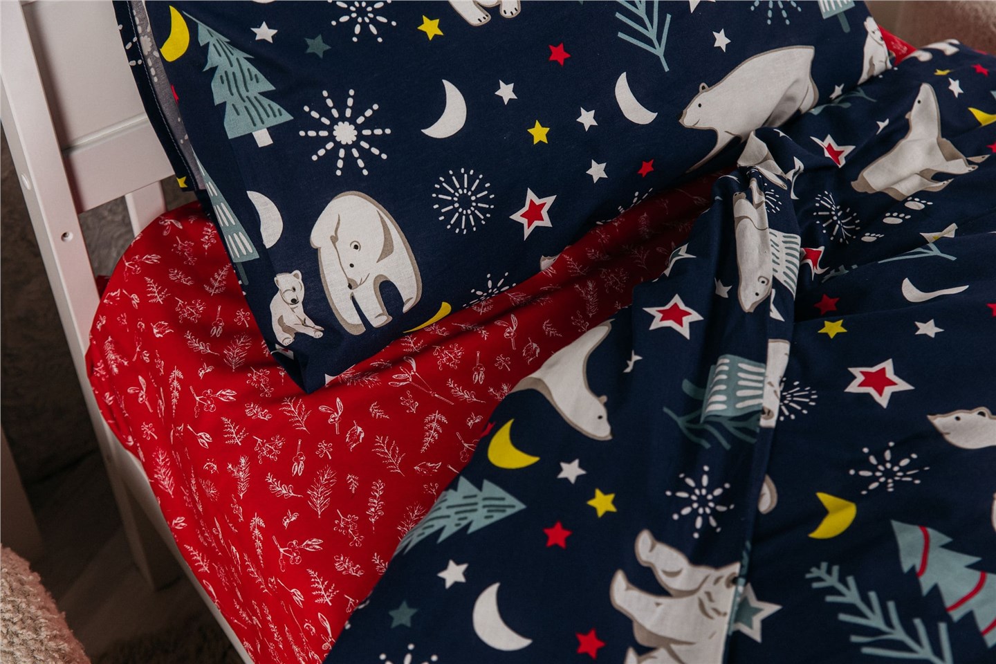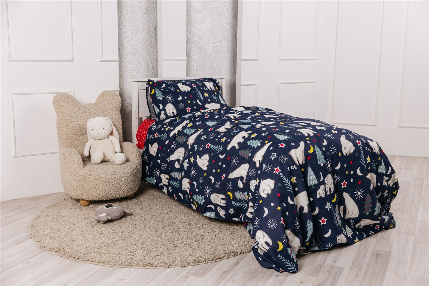 Создайте в детской атмосферу зимней сказки: глубокий тёмно-синий фон, звёзды и луны, хвойные деревья и забавные белые медвежата. Комплект из натуральной бязи мягко укутывает, «дышит» и держит форму после множества стирок. Простыня с резинкой надёжно фиксируется на матрасе, а пододеяльник на молнии экономит время при смене белья. Яркий принт радует глаз и не линяет, красный лист-простыня с белыми веточками добавляет тёплый акцент.