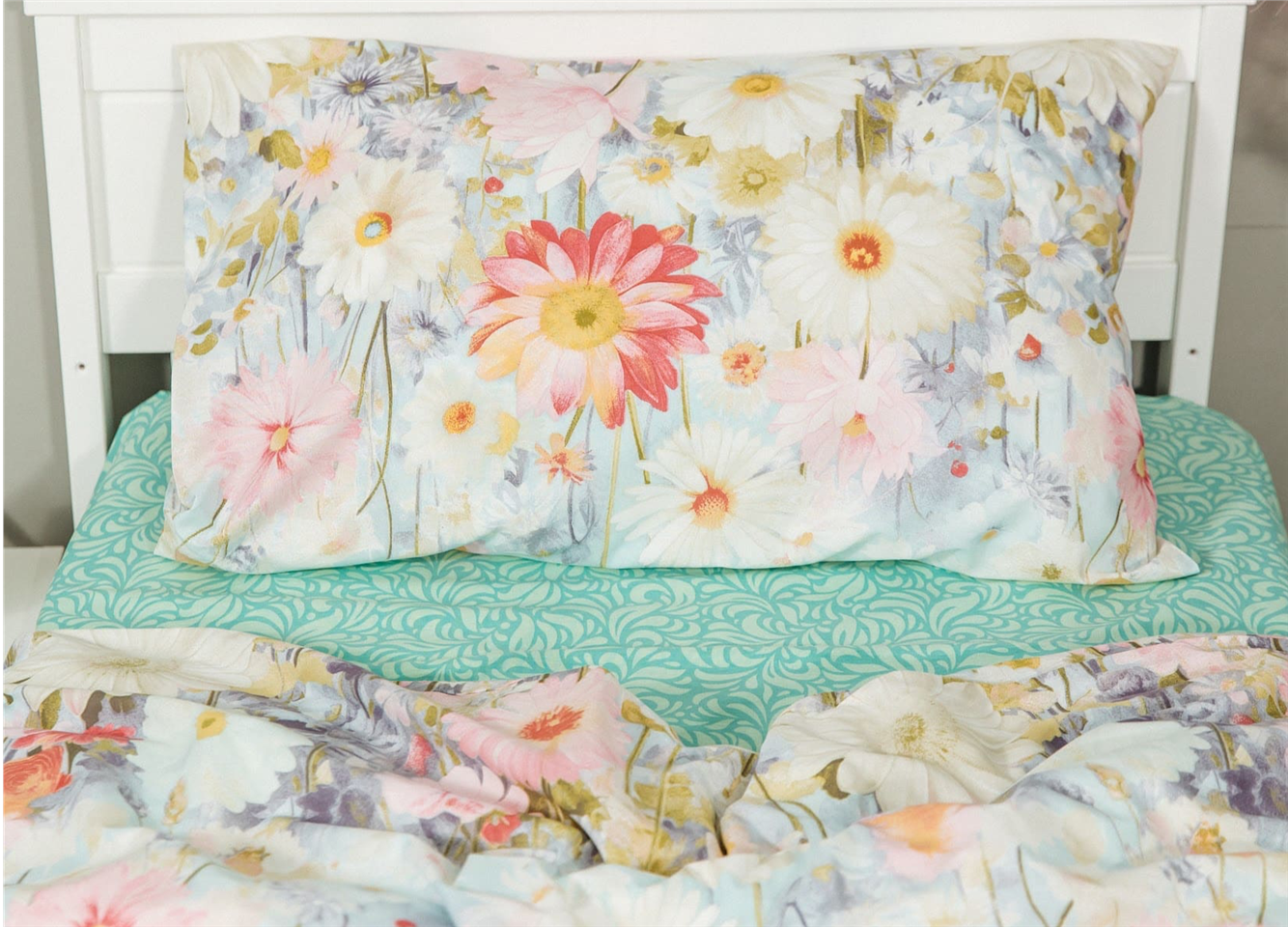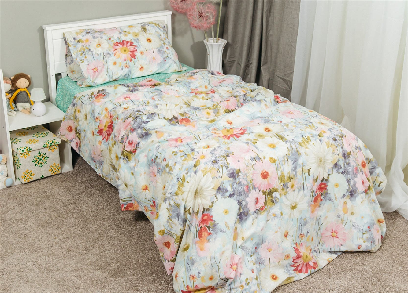 Лёгкий, нежный и по-весеннему свежий комплект, вдохновлённый утренним садом, где расцветают ромашки, герберы и васильки.