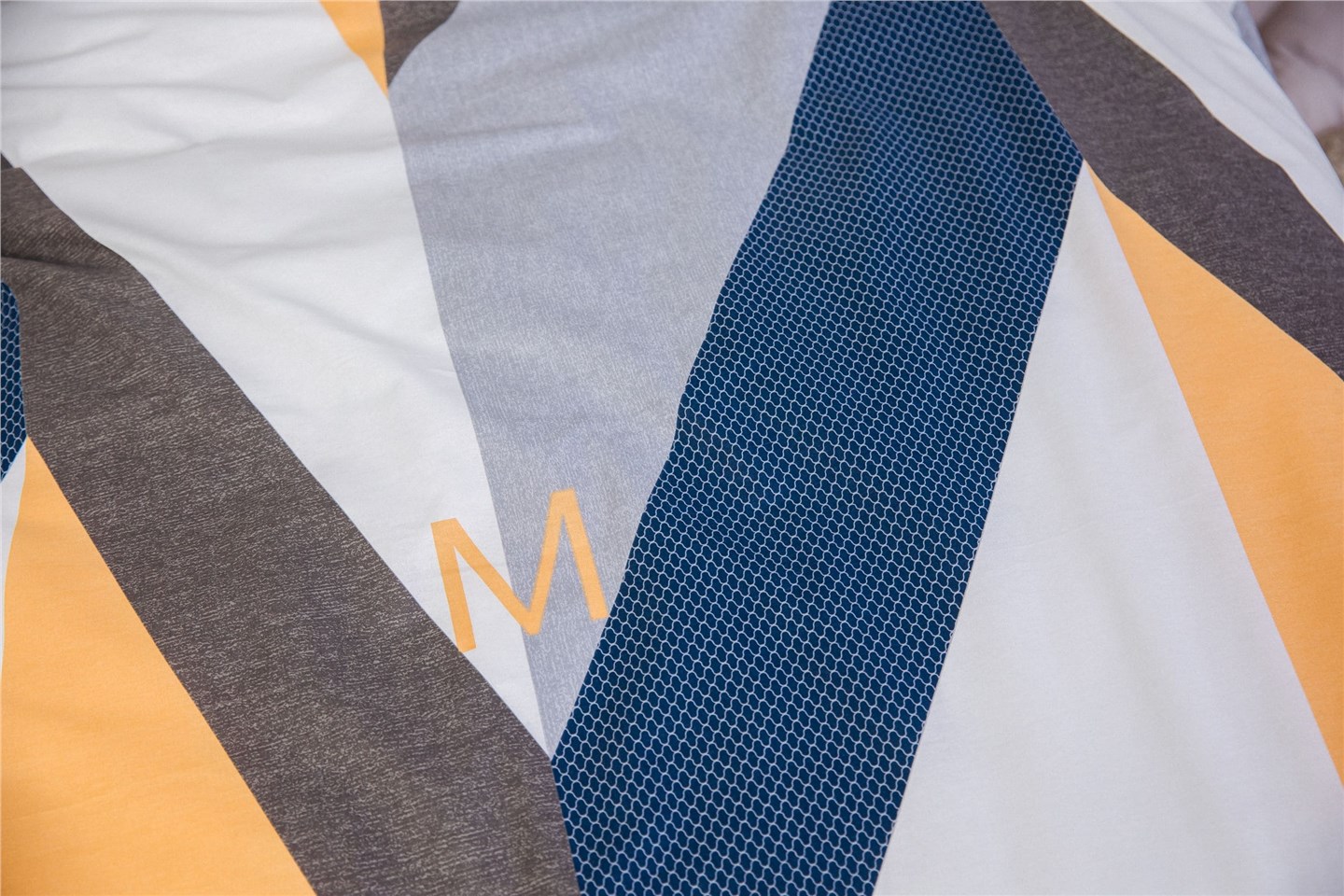 Динамичные геометрические полосы в оттенках графита, белого, жёлтого и синего придают спальне современный, энергичный вид.