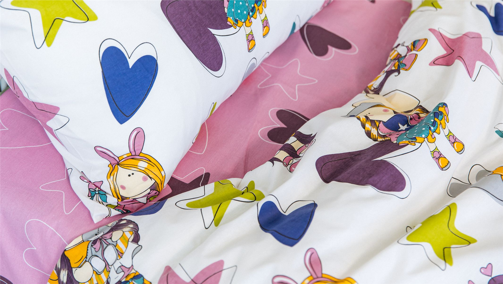 Комплект «Куколки» создан для уютных вечеров, спокойных ночей и счастливых пробуждений. Яркий принт с милыми куколками, звёздочками и сердечками превращает обычную кровать в волшебный уголок, где живут добрые сны и детские фантазии.