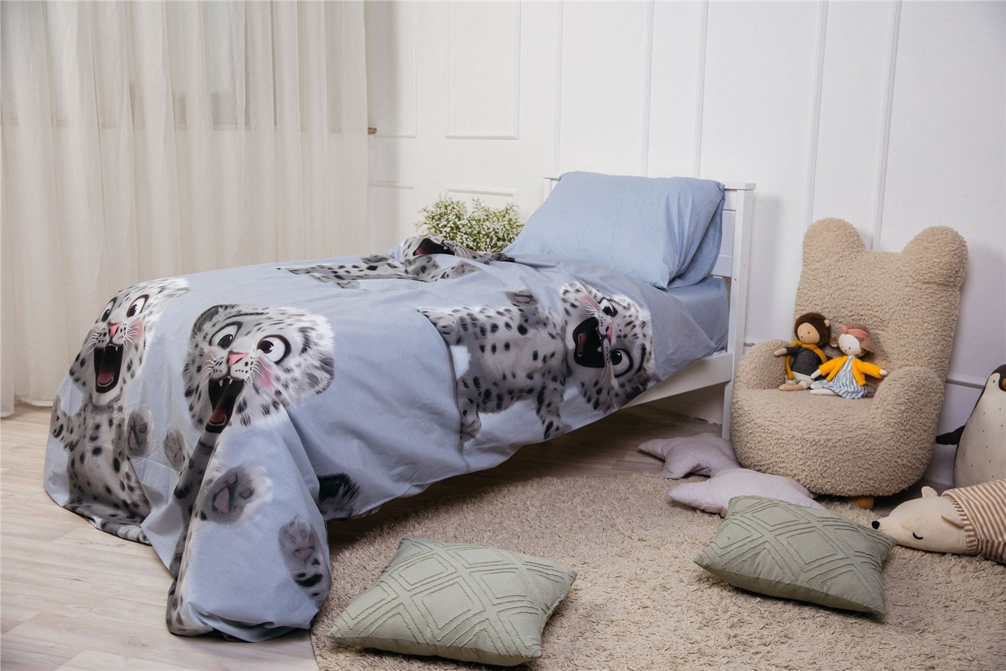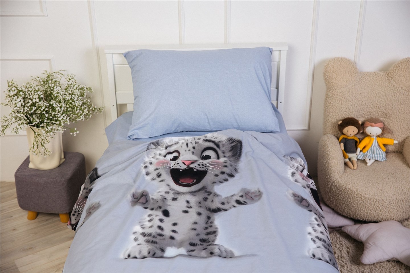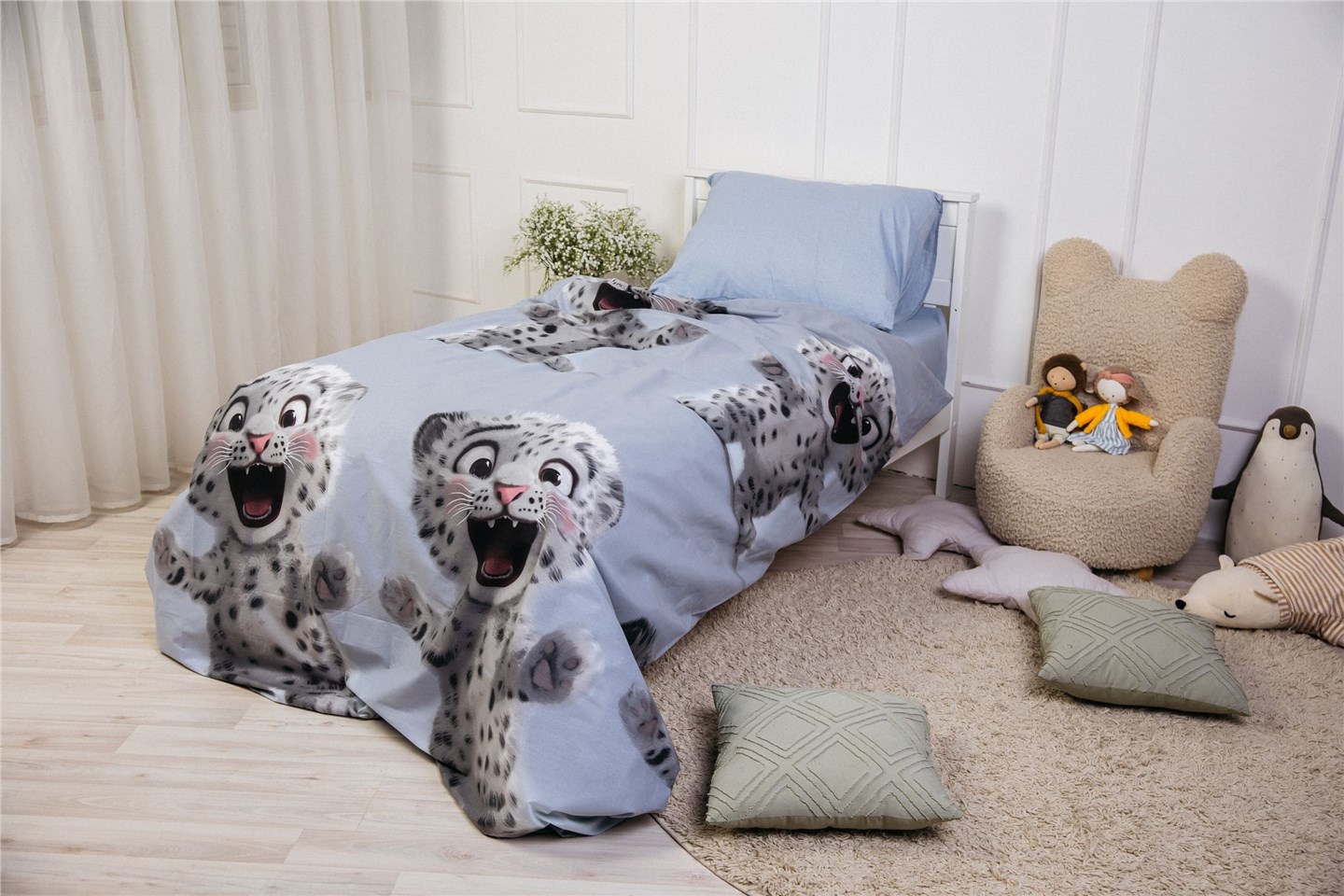 Нежный детский комплект из мягкого поплина, украшенный забавным снежным леопардом. “Leopardo” наполняет детскую комнату уютом, нежностью и радостью перед сном.