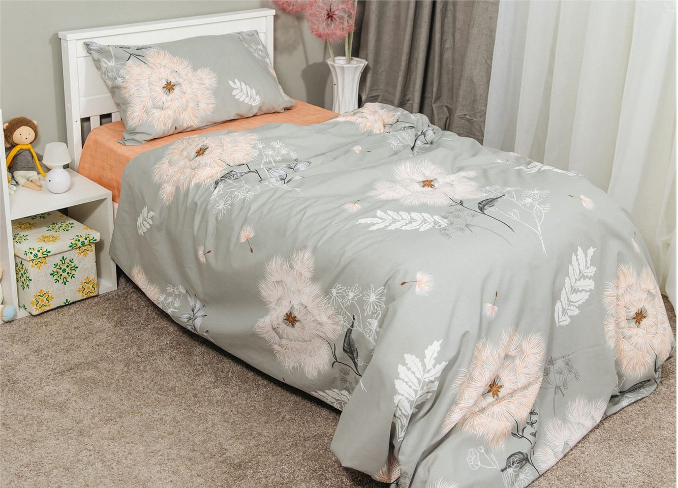 Этот комплект словно вдохновлён весенним ветром — лёгкий, свежий и естественный. На мягком фоне оттенка серого шалфея распускаются воздушные одуванчики, папоротники и полевые цветы, а изнанка выполнена в тёплом терракотовом цвете — идеальное сочетание уюта и стиля.