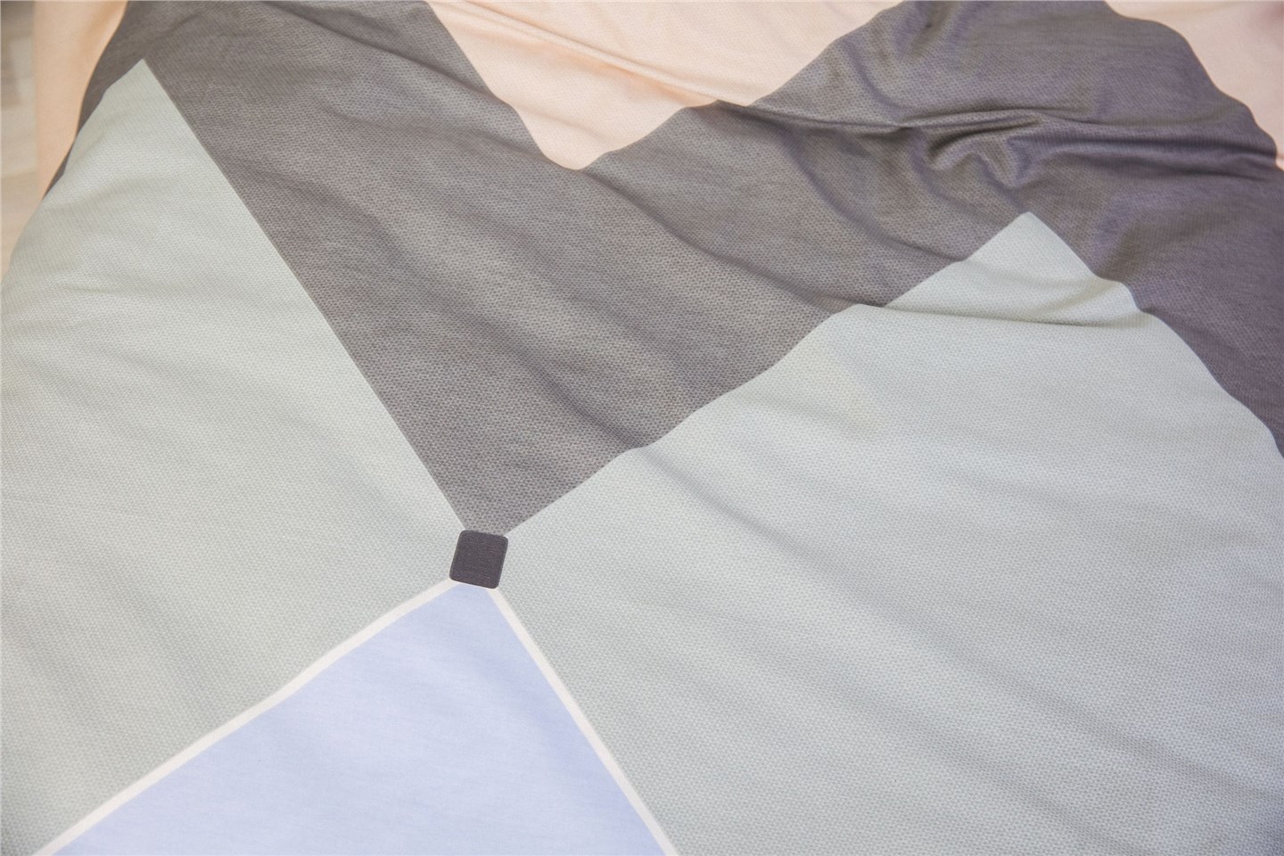 Лёгкие оттенки голубого, песочного и серого соединяются в стильной геометрии, создавая гармоничный и современный акцент в спальне.