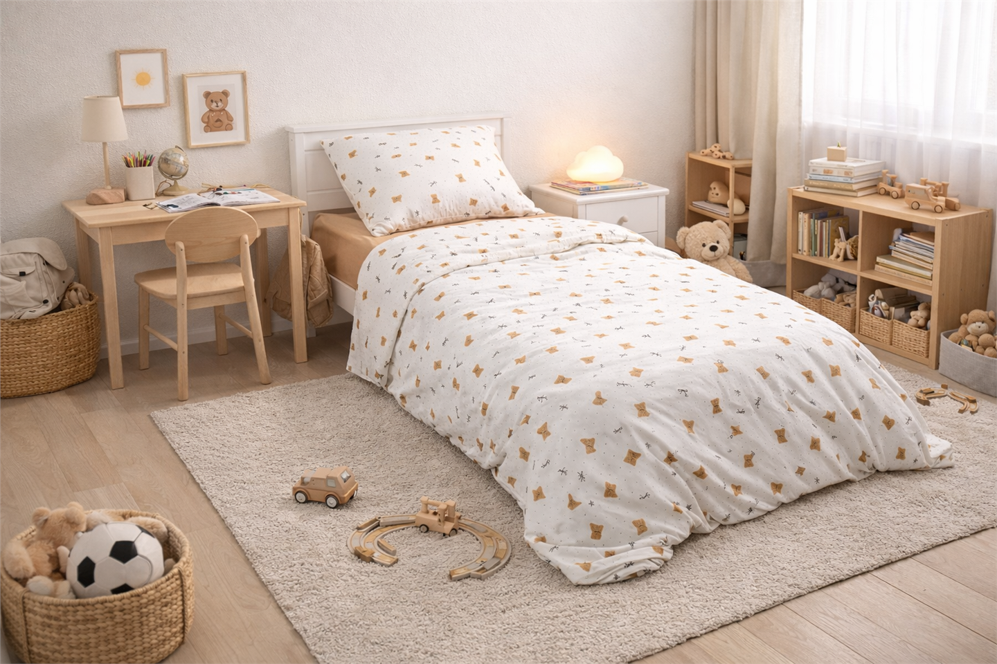 Комплект «Мишки» — это гармоничное сочетание нежного дизайна, качества и заботы о комфорте ребёнка. Именно такие детали делают дом по-настоящему тёплым и любимым.