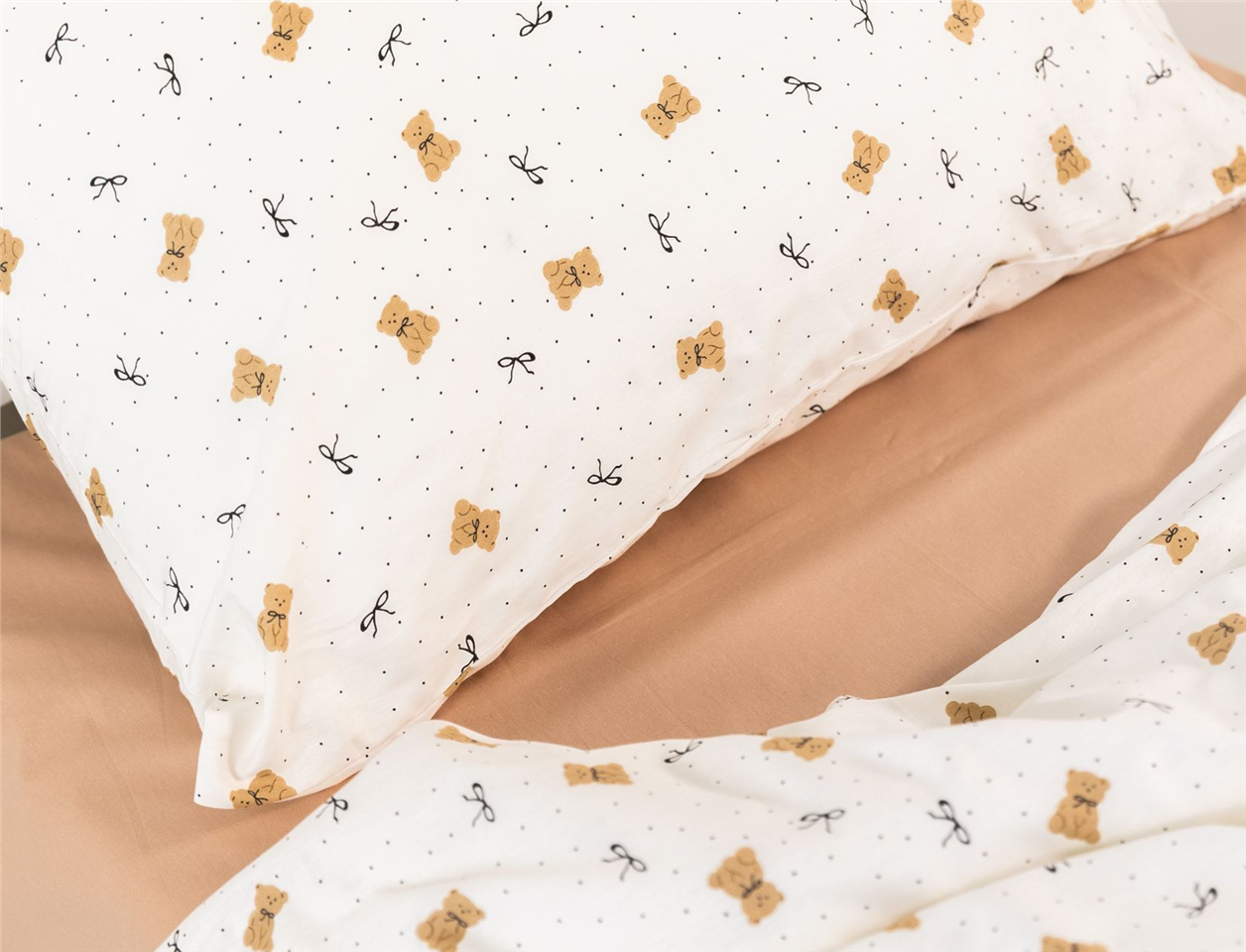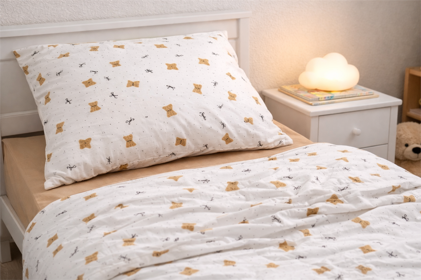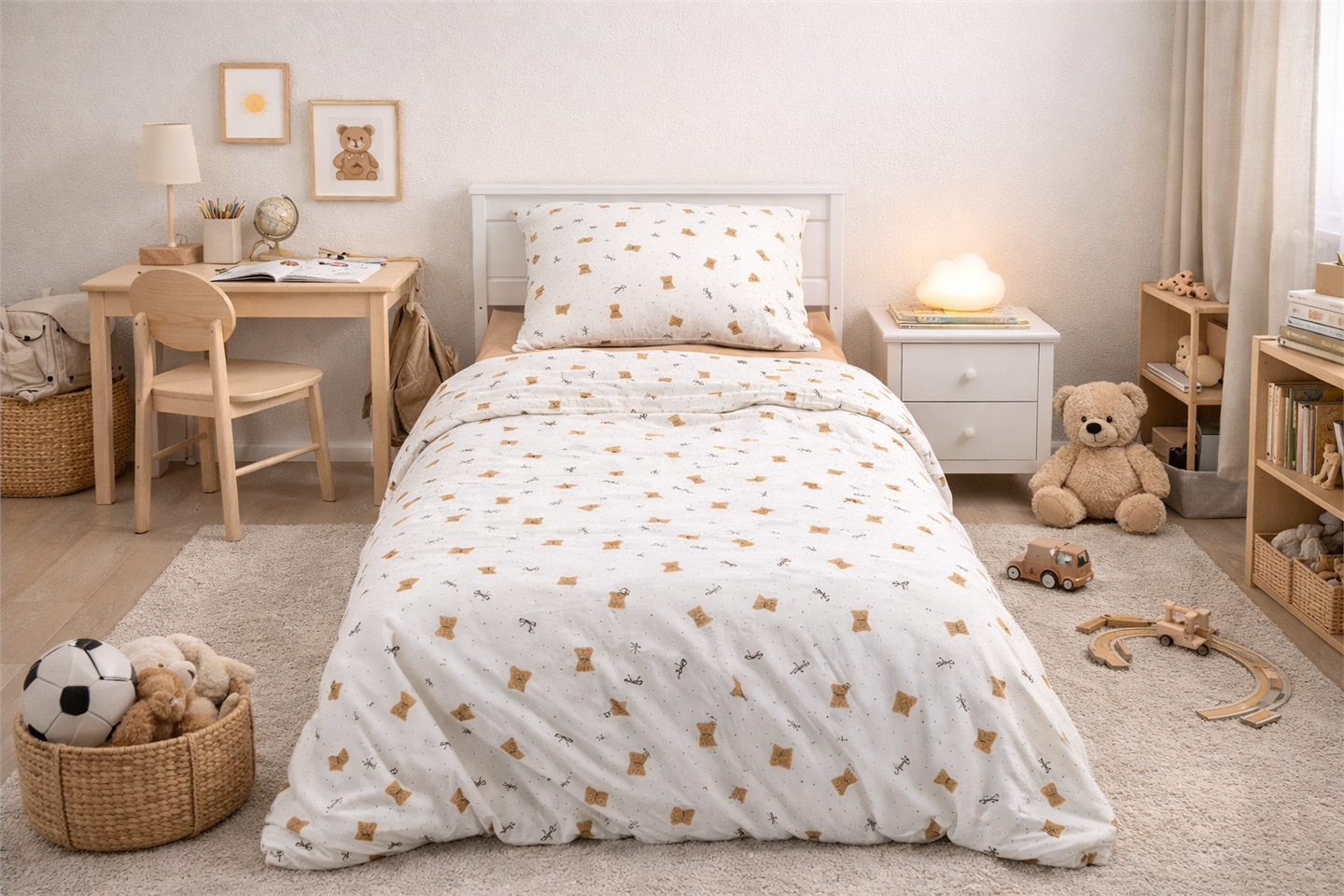 Нежный светлый комплект с очаровательными мишками создаёт в детской комнате атмосферу тепла, спокойствия и заботы. Лёгкий, воздушный дизайн с милыми деталями помогает сформировать уютное пространство, в котором ребёнку приятно отдыхать, играть и засыпать с хорошим настроением.