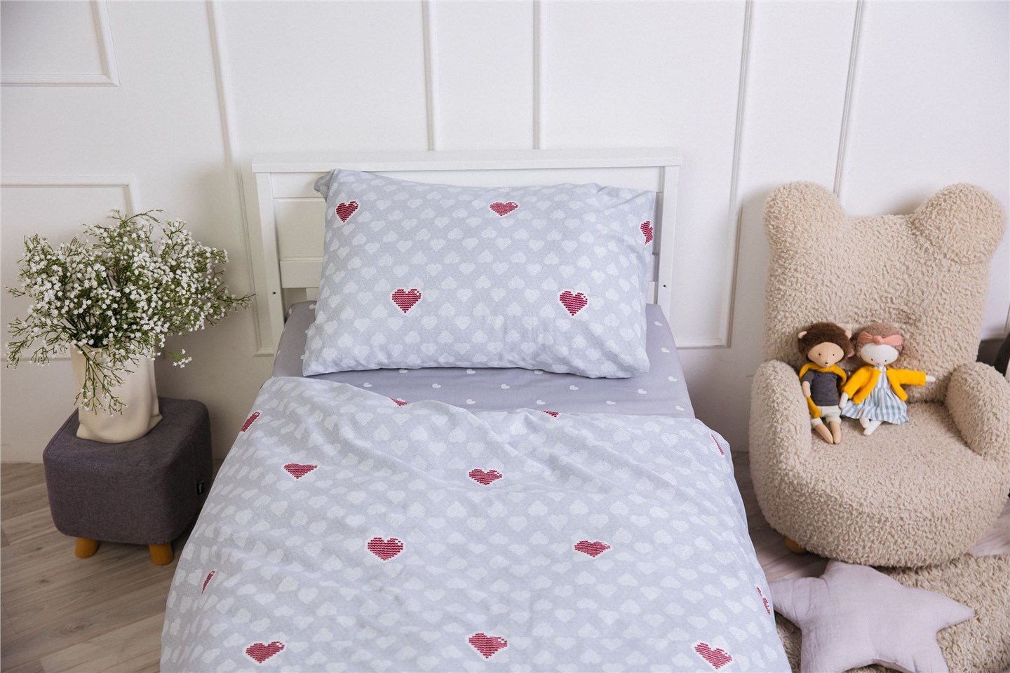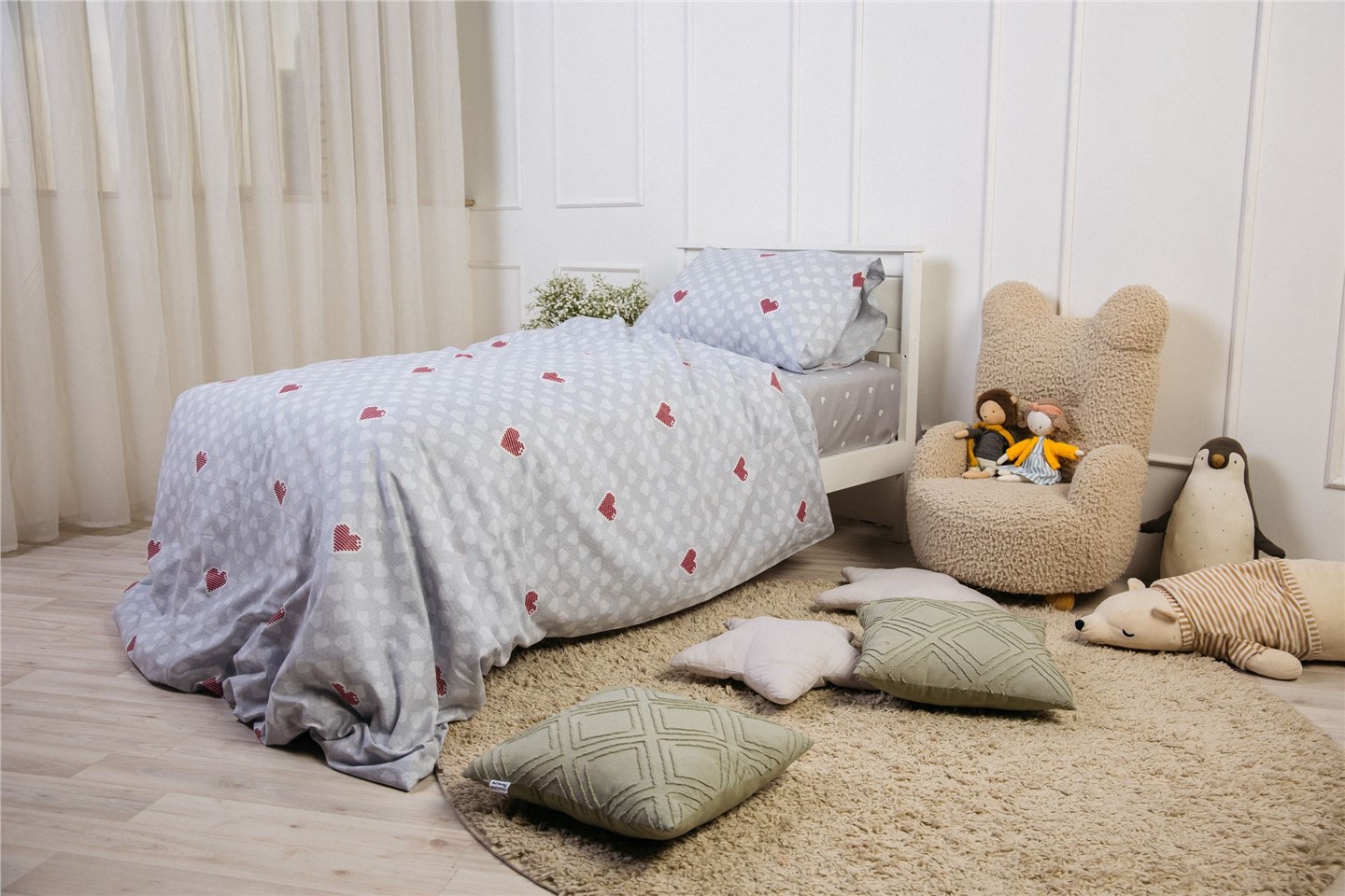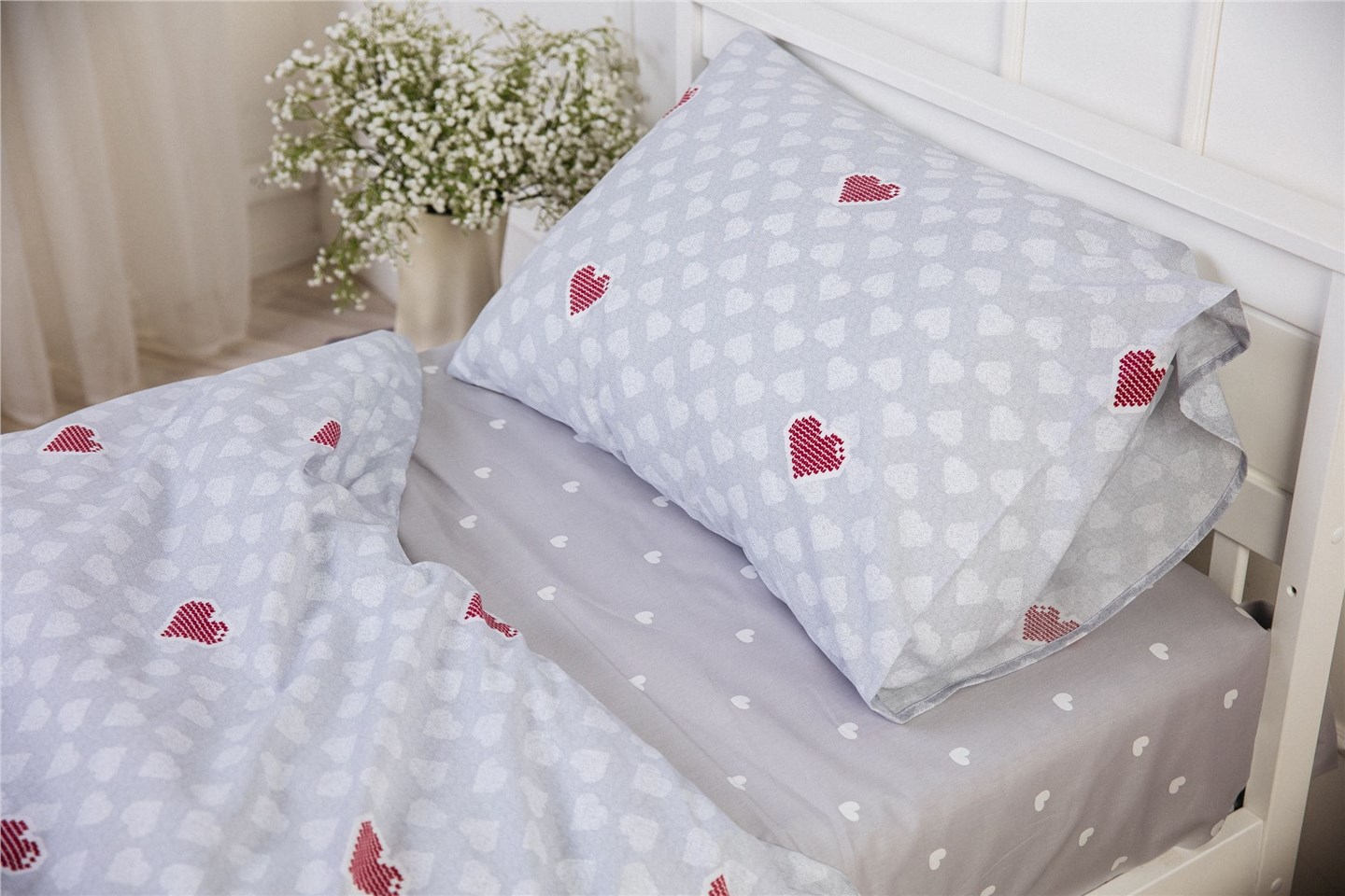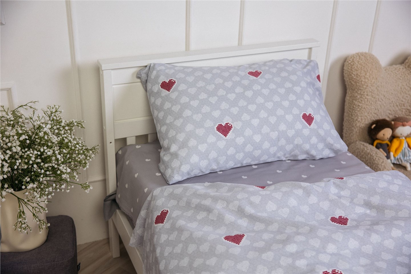 Серый фон с тонким принтом белых сердечек и яркие акценты в виде алых вышитых сердец создают ощущение тепла и уюта. Это не просто бельё — это настроение заботы и домашней гармонии.