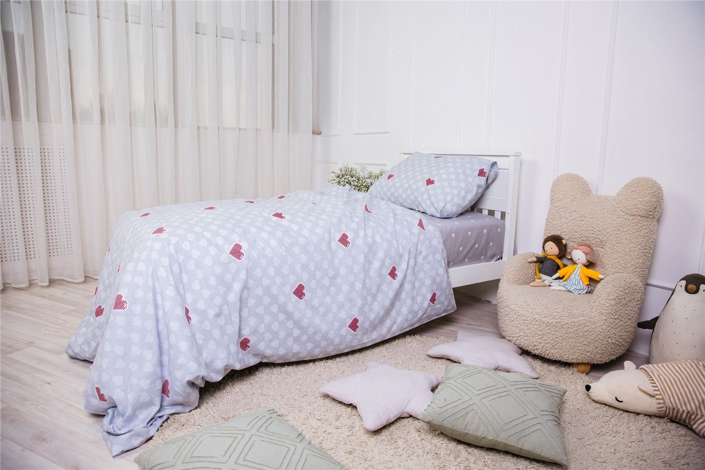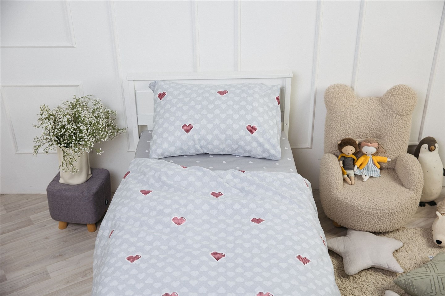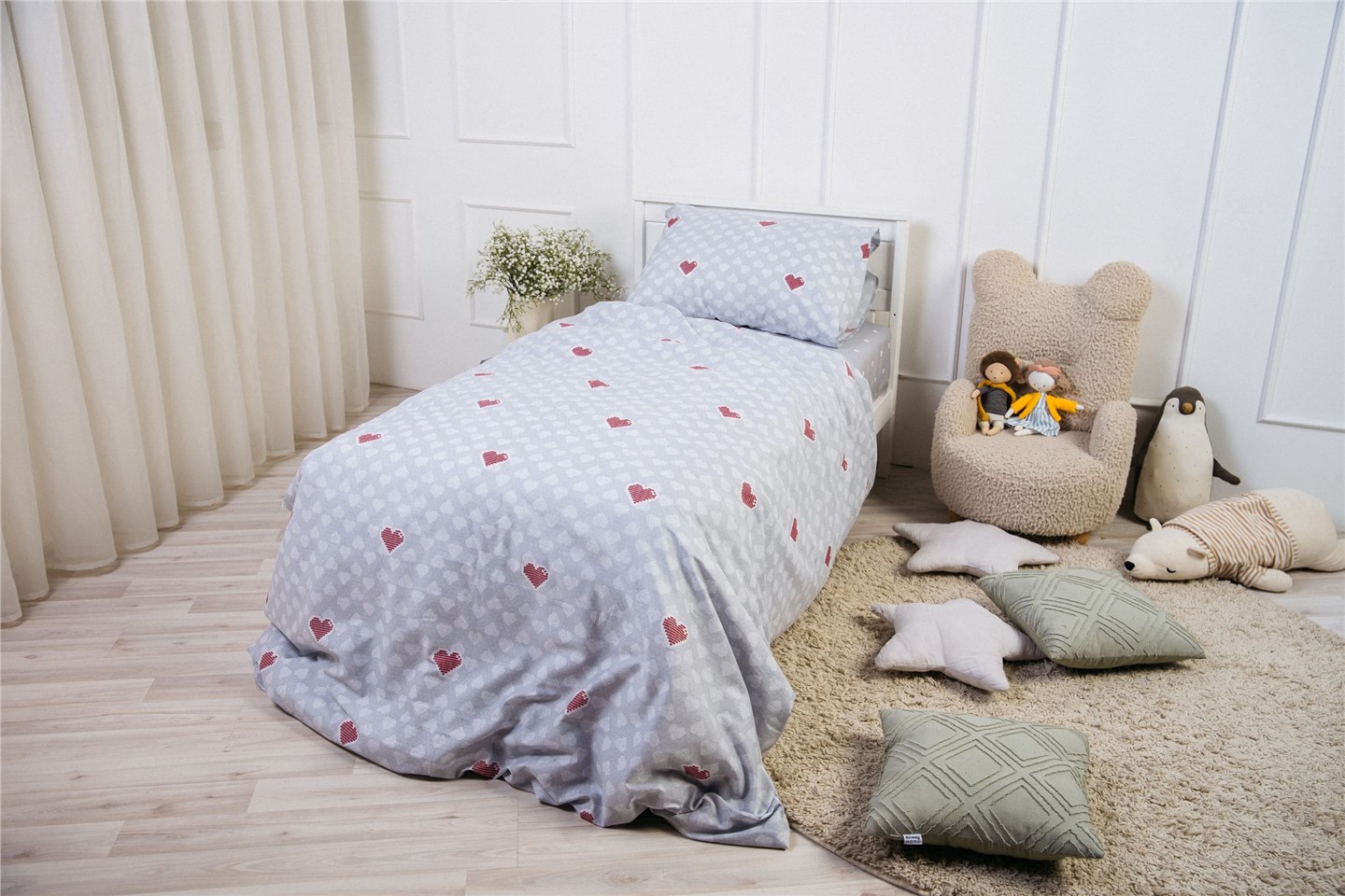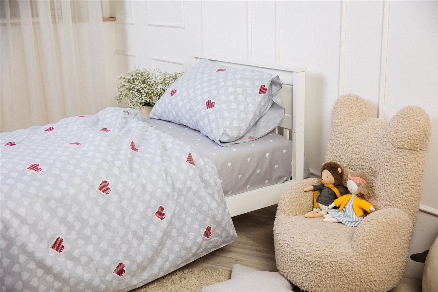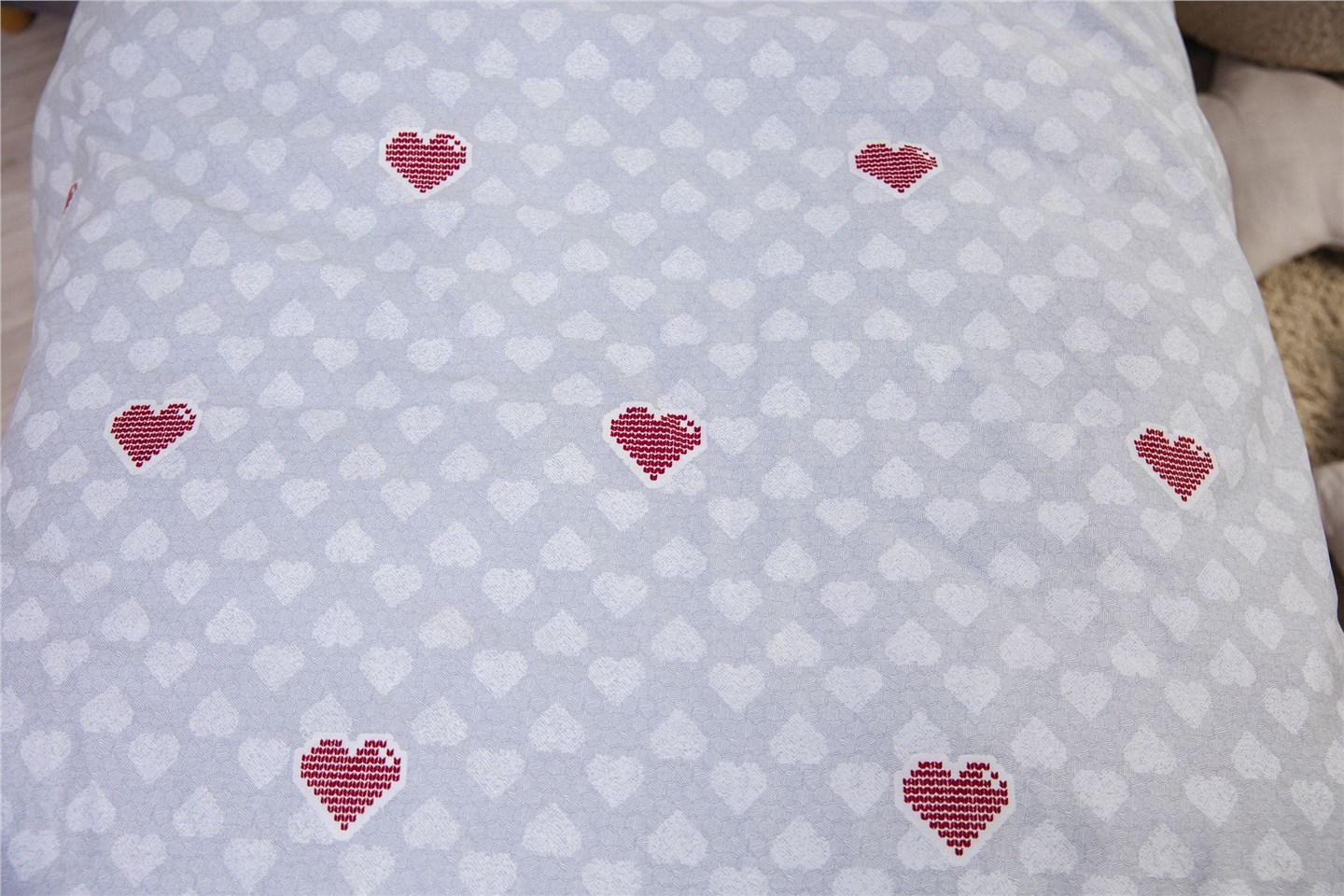 Серый фон с тонким принтом белых сердечек и яркие акценты в виде алых вышитых сердец создают ощущение тепла и уюта. Это не просто бельё — это настроение заботы и домашней гармонии.